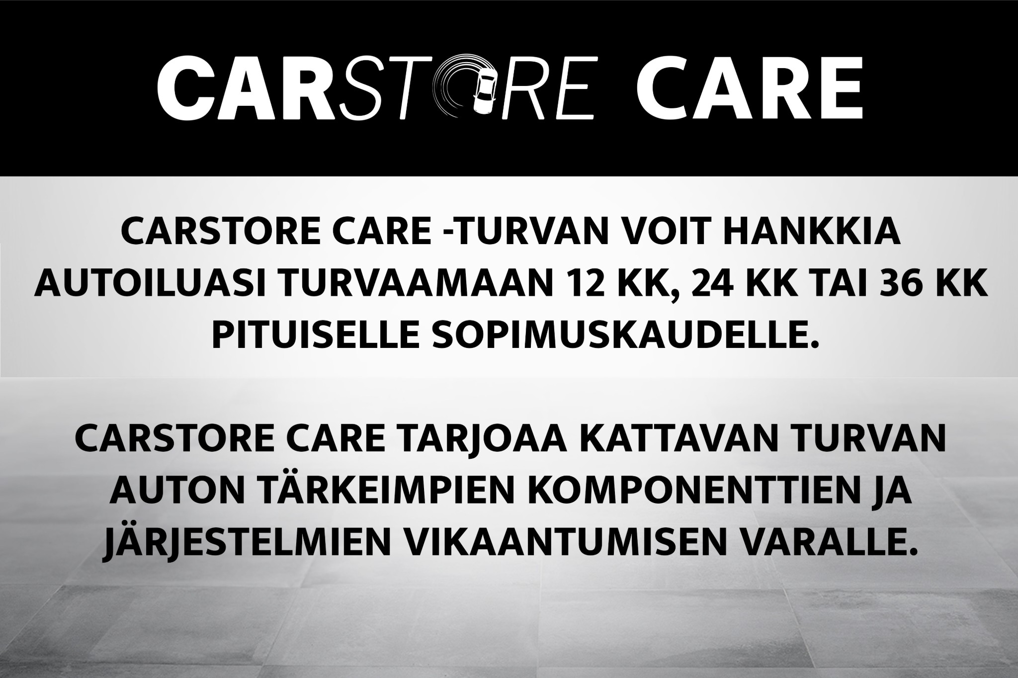- Tähän autoon on saatavilla Carstore Care lisäturva 12 kk, 24 kk tai jopa 36 kk. Carstore Care lisäturva on voimassa siihen asti kun auto saavuttaa 300 000 km tai se saavuttaa 20 vuoden iän, tai sopimusaika päättyy.